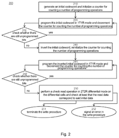 - A write method for 2T2R resistive memories that alternates between 1T1R mode programming and check read operations, incrementing or decrementing a counter for each programming step, and performs a final check in 2T2R differential mode to ensure data accuracy, reducing the number of write operations and energy consumption.