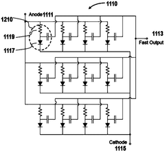 Technical Solution: Opsys Tech has developed an innovative approach to eye-safety compliance in high-power LiDAR systems through their Pure Solid-State Scanning (PSSS) technology enhanced with metasurface optics. Their solution integrates specially designed metasurface elements that enable precise control over laser beam characteristics without requiring mechanical components. The metasurfaces in Opsys' system consist of nanoscale structures that manipulate light at the sub-wavelength level, allowing for sophisticated beam shaping and energy distribution control. Their LiDAR architecture employs a unique combination of VCSEL (Vertical-Cavity Surface-Emitting Laser) arrays and metasurface optical elements to create a system that inherently distributes laser energy across multiple beams, reducing peak power density while maintaining effective detection range. This approach enables their LiDAR systems to achieve Class 1 eye-safety ratings under IEC 60825-1 standards while delivering detection ranges suitable for automotive and industrial applications. The metasurface components in their design enable dynamic adjustment of beam divergence based on detection requirements, automatically expanding beam width when operating at close ranges where eye-safety concerns are most critical.