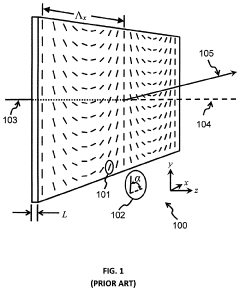 - The use of twist-uniform-twist (TUT) cycloidal diffractive waveplates and polarization volume gratings in beam steering systems, where the optical anisotropy axis orientation varies along multiple Cartesian coordinates, and the incorporation of polarization converters to optimize diffraction efficiency at steep angles and across a broad wavelength range.