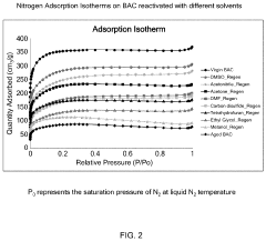 - A method involving the use of a vapor-phase stream of organic solvents such as dimethyl sulfoxide, acetonitrile, or tetrahydrofuran, passed over VOC-loaded BAC to extract VOCs, allowing for regeneration at lower temperatures and recovering the solvents for reuse, thereby maintaining the carbon's adsorption capacity and reducing mechanical stress.