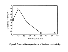 - A Zr-doped compound Li(Ti1-xZrx)2(PS4)3 is synthesized through a method involving mechanical milling or melt-quenching followed by heat treatment at temperatures between 350°C and 500°C, optimizing the crystal structure for enhanced ionic conductivity.