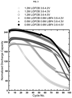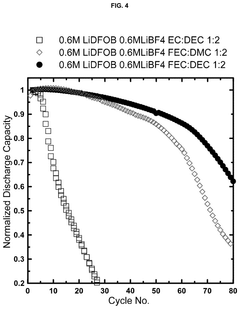 Electrolyte formulations also struggle with limited lithium metal reversibility. During cycling, significant portions of lithium become electrochemically inactive due to side reactions with the electrolyte, leading to capacity fade and shortened cycle life. Most current formulations can only sustain 100-200 cycles before significant capacity degradation occurs, far below the 1,000+ cycles required for commercial applications.