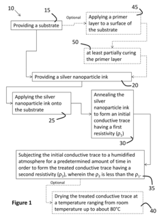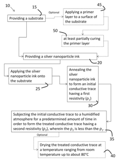 - A method involving silver nanoparticle inks applied to plastic substrates, annealed at low temperatures (up to 120°C), and then treated in a humidified atmosphere to reduce resistivity by at least a factor of 2, using hygroscopic capping agents like polyvinylpyrrolidone, which are partially removed to enhance particle contact and conductivity.