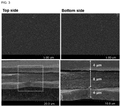 Technical Solution: Toray has developed a novel approach to anion exchange membranes based on fluorinated aromatic polymers with pendant quaternary ammonium groups. Their technology utilizes a multi-block copolymer architecture where hydrophobic fluorinated segments provide mechanical strength and chemical stability, while hydrophilic segments containing quaternary ammonium groups facilitate ion transport. Toray's proprietary synthesis method involves controlled radical polymerization to achieve precise molecular weight distribution and block length, resulting in optimized microphase separation. Their latest generation AEMs demonstrate hydroxide conductivity of 120-150 mS/cm at 80°C with alkaline stability maintained for over 2000 hours at pH 14. Toray has also developed composite membranes incorporating nanoparticles that enhance water retention and ion transport properties, particularly beneficial for operation under low humidity conditions.