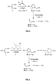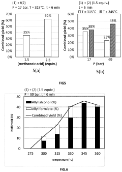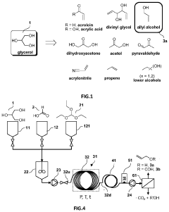 - A continuous-flow process involving the deoxydehydration of glycerol by mixing it with a carboxylic acid or triethyl orthoester, such as triethyl orthoformate, to form a reactive solution with reduced viscosity, allowing efficient flow through microreactor channels at moderate temperatures and pressures, producing allyl compounds like allyl alcohol and allyl formate with high yields.