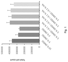 Advanced formulation approaches can reduce the required concentration of DMSO in pharmaceutical and research applications. These techniques include microemulsions, liposomes, nanoparticles, and other delivery systems that enhance the efficacy of reduced DMSO concentrations or enable its partial replacement. By optimizing formulation parameters, researchers can maintain therapeutic efficacy while minimizing potential toxicity concerns associated with higher DMSO concentrations.Expand Specific Solutions04 Comparative toxicity and efficacy assessment methods