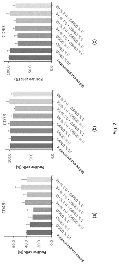 Technical Solution: Lonza has developed a comprehensive portfolio of DMSO alternatives for cryopreservation, focusing on their proprietary CryoStor® and HypoThermosol® formulations. These solutions utilize novel combinations of sugars, polymers, and antioxidants to replace DMSO while maintaining cell viability. Their technology employs specialized buffer systems that mitigate osmotic stress during freezing and thawing processes. Lonza's approach incorporates protein-free formulations that reduce immunogenic responses in clinical applications, particularly important for cell therapies. Their research has demonstrated comparable or superior post-thaw recovery rates (>80%) for various cell types including stem cells and primary cells when compared to traditional DMSO-based methods[1]. The company has also developed specialized protocols for controlled-rate freezing that optimize the performance of their DMSO-alternative solutions.