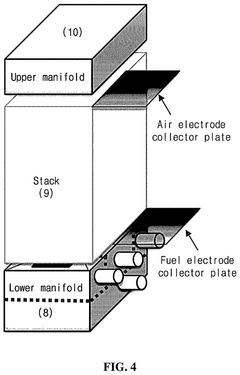 Material compatibility issues arise at these elevated temperatures, particularly at the interface between different components such as electrodes, electrolytes, and interconnects. The thermal expansion coefficient mismatch between these materials can lead to mechanical stress, cracking, and ultimately system failure over time. Additionally, the sealing technology must maintain gas-tight integrity across thermal cycles while preventing cross-contamination between fuel and oxidant streams.