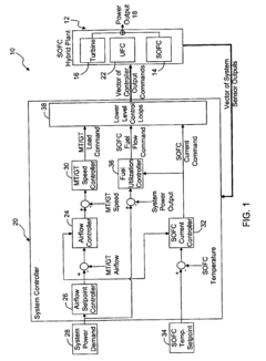 - A system controller coordinates the operation of SOFC and turbine generators, regulating parameters like airflow, fuel flow, and temperature to maintain a predetermined SOFC temperature setpoint and ensure stable power output, using lower-level control loops and feedback structures to manage thermal and electrical outputs.