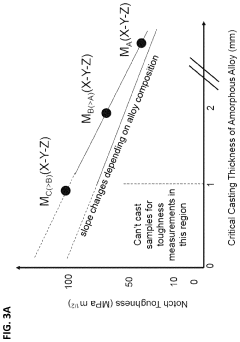 - The development of hypoeutectic amorphous metal alloys with higher main metal content and lower glass forming ability, combined with fast cooling rates in additive manufacturing processes, to produce bulk amorphous metal parts with enhanced toughness and fragility, allowing for the creation of parts with notch toughness greater than 60 MPa m1/2 through processes like powder bed fusion and directed energy deposition.