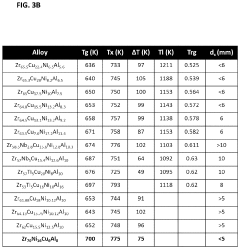 Technical Solution: Heraeus Amloy has developed a comprehensive technological ecosystem for amorphous metals (metallic glasses) focused on industrial-scale applications. Their proprietary approach centers on zirconium and palladium-based alloy systems optimized for injection molding and 3D printing processes. The company has pioneered a specialized vacuum induction melting and casting system that can produce amorphous components with wall thicknesses up to 50mm, significantly exceeding traditional limitations of critical casting thickness. Their AMLOY® production technology incorporates precise thermal management during solidification, achieving cooling rates of 10^5-10^6 K/s necessary for amorphous structure formation while minimizing internal stresses. For sustainable manufacturing, Heraeus has implemented a closed-loop material recovery system that reclaims up to 98% of production scrap, and their process reduces energy consumption by eliminating multiple manufacturing steps required in conventional metal processing. The company's 3D printing technology for amorphous metals uses a modified laser powder bed fusion process with specialized parameter sets that maintain the amorphous structure throughout the build, enabling complex geometries impossible with traditional manufacturing.
