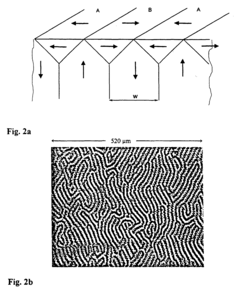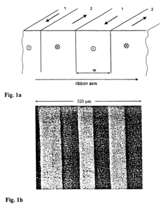 Technical Solution: VACUUMSCHMELZE has developed proprietary VITROPERM® and NANOPERM® amorphous metal alloys specifically engineered for high-performance magnetic applications. Their technology involves rapid solidification processes where molten metal is cooled at rates exceeding 1 million degrees per second to create ribbon-like amorphous structures. These materials undergo precise annealing treatments to develop nanocrystalline structures within the amorphous matrix, resulting in exceptional soft magnetic properties. VACUUMSCHMELZE's amorphous metals demonstrate permeability values up to 150,000 and saturation flux densities reaching 1.2 Tesla, with core losses reduced by up to 80% compared to conventional silicon steel. Their manufacturing process includes specialized casting techniques and controlled atmosphere processing to ensure consistent material properties across production batches.