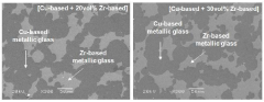 Technical Solution: NIMS has developed advanced melt-spinning techniques for producing amorphous metal ribbons with precisely controlled thicknesses ranging from 20-50 micrometers. Their research focuses on iron-based amorphous alloys containing strategic additions of boron, silicon, phosphorus and rare earth elements to enhance glass-forming ability and functional properties. NIMS has pioneered the development of Fe-Si-B-P-Cu amorphous alloys that demonstrate saturation magnetization exceeding 1.8 Tesla while maintaining low coercivity values below 2 A/m. Their materials science approach includes atomic-scale characterization using advanced synchrotron radiation techniques to understand short-range ordering phenomena in amorphous structures. NIMS researchers have established correlations between processing parameters, structural relaxation behaviors, and resulting mechanical/magnetic properties, enabling tailored material development for specific applications.
