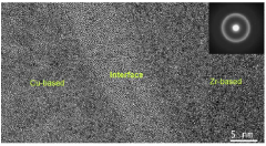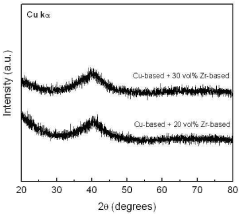 - A composite amorphous metal material is created by mixing two or more amorphous phases with a common supercooled liquid phase region, processed in that temperature range to form a stable and dense interface, using Cu-based and Zr-based amorphous metal materials.