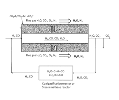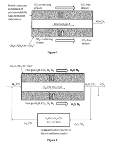 - A porous metal membrane comprising nickel (Ni), silver (Ag), or their combinations with molten carbonate within the pores is used to separate CO2 from flue gas streams, employing electrochemical principles to selectively capture CO2 and produce a CO2-free flue gas output stream.