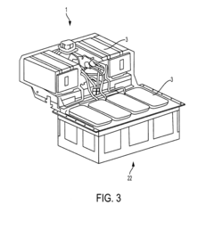 Strengths: Sophisticated hybrid cooling approach that optimizes energy efficiency; innovative use of phase-change materials for passive temperature regulation; advanced predictive maintenance capabilities through machine learning. Weaknesses: Complex integration of multiple cooling technologies increases potential failure points; phase-change materials add weight and cost to battery modules; system requires substantial data collection and processing infrastructure.