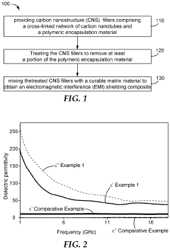 Nanostructured fillers, including nanoparticles, nanowires, and nanofibers, offer significant advantages for EMI shielding applications due to their high surface area and unique properties at the nanoscale. These materials can achieve effective EMI shielding at much lower loading levels compared to conventional fillers, resulting in lightweight composites. Additionally, nanostructured fillers can be surface-modified to improve dispersion within the polymer matrix and enhance interfacial interactions, leading to better mechanical properties and more uniform shielding performance.Expand Specific Solutions05 Processing techniques for optimized filler dispersion