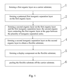 - A manufacturing method involving the patterning of an inorganic separation layer between organic layers, using electrostatic spinning to create a mesh structure with gaps, allowing direct contact between inner organic layers and enhancing adhesion, thereby improving the peeling-off process and water/oxygen blocking efficiency.