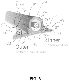 Technical Solution:  Myant has developed a comprehensive approach to smart textile sensor stability through their Skiin platform. Their technology integrates conductive fibers directly into textiles using advanced knitting techniques that maintain sensor integrity during repeated wear and washing cycles. Myant's sensors employ a proprietary encapsulation method that shields electronic components from moisture, sweat, and environmental contaminants while maintaining breathability. Their long-term stability solution includes self-calibrating algorithms that compensate for signal drift over time by establishing baseline measurements and adjusting for gradual changes in sensor performance. Additionally, Myant implements redundant sensing elements within their textiles to ensure continuous data collection even if individual sensors degrade. Their textiles undergo rigorous testing protocols simulating years of real-world use, including exposure to various temperatures, humidity levels, and mechanical stress to validate long-term performance in actual wearing conditions.