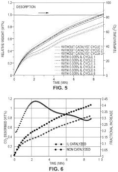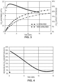 - Development of CO2 capture sorbents comprising a solid support with CO2-sorbing amine and ionic liquid, which enhances CO2 sorption and desorption characteristics, allowing for regeneration at lower temperatures and maintaining high selectivity and capacity through catalytic action.