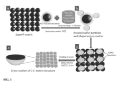 - A method involving the functionalization of conductive carbon black particles to form a sulfur-covering-carbon nanostructured sponge, where sulfur is dispersed and heated to form a coating over the carbon particles, creating a nanostructured sponge cathode that accommodates volume expansion and restricts polysulfide dissolution, enhancing cyclability and capacity retention.