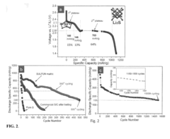 Various protective coatings and interlayers can be applied to sulfur cathodes to mitigate polysulfide shuttling and improve battery performance. These include polymer coatings, inorganic layers, and functional separators. The protective materials act as physical barriers to prevent polysulfide migration while maintaining ionic conductivity. Some designs incorporate multiple layers with different functionalities to simultaneously address multiple degradation mechanisms in lithium-sulfur batteries.Expand Specific Solutions04 Electrolyte systems for sulfur cathodes