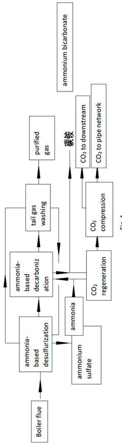 - An integrated ammonia-based desulfurization and decarbonization process where the ammonia-containing process gas is absorbed by a desulfurization circulating liquid, and the absorbed solution is returned for further desulfurization, with fresh water washing and membrane separation to recycle condensate water, eliminating the need for separate cooling devices and reducing waste discharge.