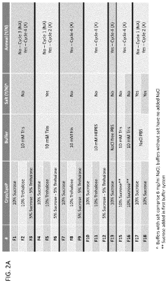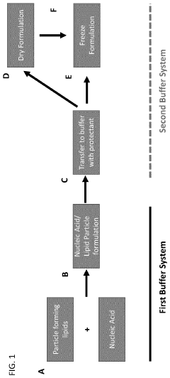 Freeze-drying and lyophilization are critical processes for enhancing the long-term stability of lipid nanoparticles. These techniques remove water content while preserving the structural integrity of the nanoparticles. The addition of cryoprotectants such as trehalose, sucrose, or mannitol during the process prevents fusion and aggregation of particles during freezing and subsequent storage. Optimized freeze-drying cycles with controlled freezing rates and primary/secondary drying parameters are essential for maintaining particle size distribution and encapsulation efficiency after reconstitution.Expand Specific Solutions04 pH and buffer system optimization