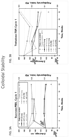 - Lyophilization and cryoprotection strategies: Freeze-drying (lyophilization) combined with appropriate cryoprotectants significantly improves the long-term stability of lipid nanoparticles. Cryoprotectants such as trehalose, sucrose, and mannitol prevent fusion and aggregation during the freezing process by replacing water molecules and maintaining the structural integrity of the lipid bilayers. The optimization of freezing rates, primary drying conditions, and secondary drying parameters is essential for preserving the physicochemical properties of the nanoparticles upon reconstitution.