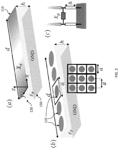 The use of low-permittivity substrate materials in metasurface antennas can significantly improve radiation efficiency and bandwidth. Low-permittivity substrates reduce surface wave propagation and dielectric losses, allowing more energy to be radiated into free space. These materials can be engineered to provide mechanical stability while maintaining the desired electromagnetic properties, making them ideal for high-frequency applications where efficiency is critical.Expand Specific Solutions04 Artificial dielectrics with engineered permittivity
