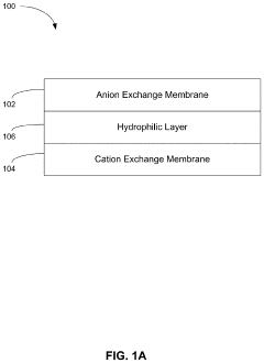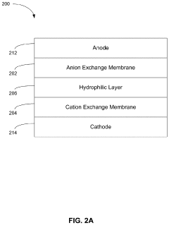 Membranes functionalized with ion-exchange groups enable selective anion transport through electrostatic interactions. These membranes contain positively charged functional groups such as quaternary ammonium or imidazolium that facilitate the transport of anions while rejecting cations. The density, distribution, and type of functional groups can be engineered to optimize transport of specific anions, making these membranes suitable for applications in water treatment, fuel cells, and electrochemical processes.Expand Specific Solutions04 Stimuli-responsive hybrid membranes for controlled anion transport