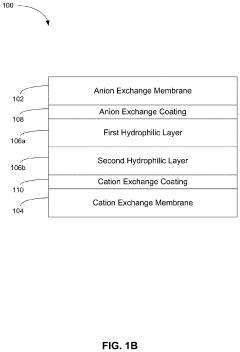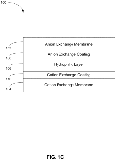 Technical Solution: Evoqua has developed advanced layered hybrid membrane systems for anion transport utilizing a multi-layer approach that combines ion exchange membranes with specialized polymer matrices. Their technology incorporates perfluorinated sulfonic acid (PFSA) polymers modified with quaternary ammonium functional groups to enhance anion selectivity and transport. The membrane architecture features distinct layers with different charge densities, creating an optimized pathway for anion migration while maintaining structural integrity. Evoqua's systems employ a proprietary cross-linking method that reduces membrane swelling while preserving ion conductivity, resulting in membranes with thickness control between 20-100 μm depending on application requirements. Their latest generation incorporates nanocomposite materials to further enhance mechanical stability and reduce fouling potential during long-term operation in water treatment applications.