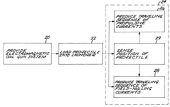 - A method that uses a traveling nulling magnetic field, produced by field-nulling currents in the electrical excitation coils, to partially nullify the propulsive magnetic field at the nose of the projectile, reducing the magnetic field exposure and minimizing the need for shielding, allowing for lighter payloads.