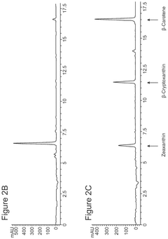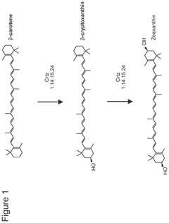- A cell-free production method using enzymes like β-carotene hydroxylase to transform β-carotene into hydroxylated carotenoids like β-cryptoxanthin and zeaxanthin, utilizing a controlled enzymatic process with co-solvents and detergents to enhance reaction efficiency and product concentration.