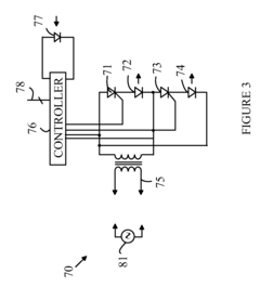 Advancements in half-wave rectifier designs focus on improving efficiency and reducing power losses. This includes the use of high-performance diodes, optimized circuit layouts, and advanced control techniques. Some designs incorporate additional components or novel configurations to enhance the rectification process and minimize voltage drops across the rectifying elements.Expand Specific Solutions03 Integration of half-wave rectifiers in power supply systems