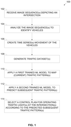 - A computer-implemented method and system using machine learning models to predict traffic patterns based on image sequences from imaging sensors, allowing for optimized control of traffic lights to improve traffic flow and reduce congestion.