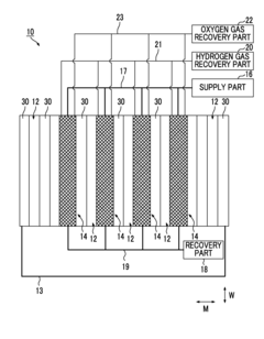 - An artificial-photosynthesis array with inclined modules and interconnected electrolytic chambers, utilizing a photoelectric conversion unit and separate hydrogen and oxygen gas generating parts, ensures constant ion concentration and pH levels by preventing gas mixing and using a functional layer with co-catalysts like Pt or Rh, and a protective layer for efficient gas separation.