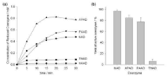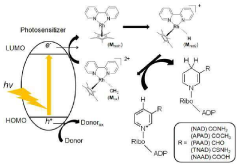 - A method using a NAD(P) derivative, dyes, sacrificial electrons, and an electron mediator, irradiated with light to regenerate NAD(P) derivatives efficiently, mimicking natural photosynthesis for eco-friendly production of high-value chemicals.