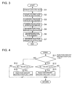 - A control device that estimates turbine revolution speed using engine operating state calculations, atmospheric pressure, intake mass flow rate, and intake temperature, without requiring direct turbine speed sensors, by employing a fuel injection control unit to restrict fuel injection when the estimated speed exceeds allowed limits, and utilizing turbocharger performance curves to accurately determine intake volume flow rates.