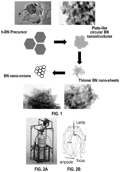 - 01 Synthesis methods for boron nitride nanosheetsVarious methods can be employed to synthesize boron nitride nanosheets, including chemical vapor deposition, exfoliation techniques, and thermal treatments. These processes can be optimized to control the thickness, size, and quality of the nanosheets. Different precursors and reaction conditions can be used to tailor the properties of the resulting nanosheets for specific applications.- Synthesis methods of boron nitride nanosheets: Various methods can be employed to synthesize boron nitride nanosheets, including chemical vapor deposition, exfoliation techniques, and thermal treatments. These processes involve the conversion of precursor materials under controlled conditions to form hexagonal boron nitride structures with nanoscale thickness. The synthesis parameters such as temperature, pressure, and precursor composition significantly influence the quality, thickness, and properties of the resulting nanosheets.