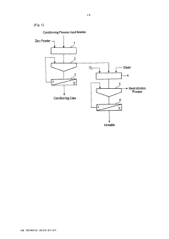 - A method involving a conditioning process to reduce the zinc sulfate solution, followed by an iron precipitation process at lower temperatures (135-150°C) and pressures (5-10 barg), using a reducing agent like zinc powder to adjust oxidation-reduction potential, and oxidizing the solution in an autoclave to produce hematite with high iron content.