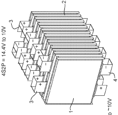 Technical Solution: Bosch has developed an integrated Battery Management System (BMS) for hybrid power systems that combines hardware and software solutions to optimize battery performance and longevity. Their system features cell balancing technology that ensures uniform charge distribution across all cells, extending battery life by up to 25%. The BMS incorporates predictive analytics algorithms that continuously monitor battery health parameters and adapt charging strategies accordingly. Bosch's thermal management solution uses a liquid cooling system integrated directly into the battery pack structure, maintaining optimal operating temperatures between 15-35°C even under high load conditions. Their modular design approach allows for scalable integration across various vehicle platforms, from mild hybrids to plug-in hybrid systems, with standardized communication protocols enabling seamless integration with existing vehicle architectures.