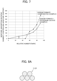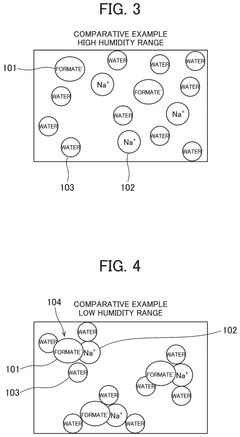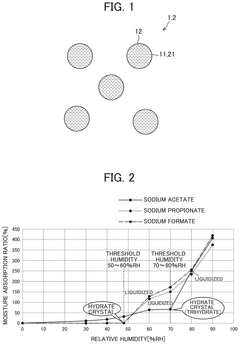 The deliquescence point of lithium nitrate can be modified through formulation with other compounds. Mixing with certain salts, polymers, or ceramic materials can raise or lower the critical relative humidity at which deliquescence occurs. These formulations are designed to create materials with specific moisture absorption properties for applications such as desiccants, humidity control systems, or stabilized energy storage materials. The modified deliquescence behavior enables lithium nitrate to be used in environments where its natural hygroscopic properties would otherwise be problematic.Expand Specific Solutions05 Industrial applications leveraging lithium nitrate deliquescence properties