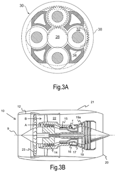 Fuel injection and atomization technologies play a crucial role in turbine engine performance. These technologies focus on optimizing the spray pattern, droplet size, and distribution of fuel in the combustion chamber. Advanced injector designs improve fuel-air mixing, enhance combustion efficiency, and reduce emissions. Innovations in this area include multi-point injection systems, pressure-swirl atomizers, and air-blast atomizers that function effectively across various engine operating conditions.Expand Specific Solutions03 Fuel system thermal management