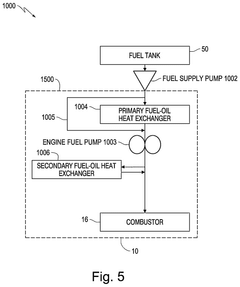 Thermal management systems for turbine engine fuel systems are essential for maintaining optimal performance. These systems regulate fuel temperature to prevent coking, vapor lock, and other temperature-related issues that can affect fuel flow and combustion efficiency. Heat exchangers, cooling circuits, and thermal barriers are employed to manage heat transfer between the fuel system and other engine components, ensuring reliable operation across a wide range of operating conditions.Expand Specific Solutions04 Alternative and multi-fuel compatibility