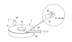 - A magnetic property measuring device and method that includes a rotating mechanism, heating/cooling mechanism, temperature measuring mechanism, laser heating mechanism, and magnetic head with writing and reading units, allowing non-contact measurement of magnetic properties by scanning and varying laser heating to determine the Curie temperature and its dispersion.