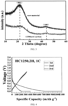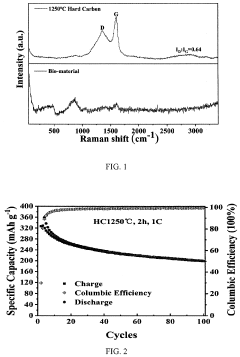 Technical Solution: Faradion has pioneered the development of sodium-ion batteries incorporating biochar-derived carbon materials as anode components. Their proprietary technology utilizes sustainable biomass-derived carbon structures that have been optimized for sodium-ion intercalation. The company's approach involves pyrolyzing organic precursors under controlled conditions to create hierarchical porous carbon structures with tailored surface functionality. These biochar-based anodes demonstrate sodium storage capacities exceeding 300 mAh/g with superior cycling stability compared to conventional hard carbons. Faradion's technology incorporates surface modification techniques to enhance the solid electrolyte interphase formation, resulting in improved first-cycle efficiency and rate capability. Their commercial cells utilizing biochar-derived anodes have achieved energy densities approaching 160 Wh/kg at the cell level, making them competitive with certain lithium-ion chemistries while offering significant cost advantages.