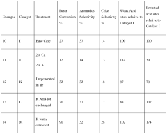 Strengths: Superior catalyst stability in hydrothermal conditions, reduced coke formation due to hierarchical pore structure, and high selectivity toward aromatic hydrocarbons. Their integrated refinery approach allows for seamless incorporation of biomass processing into existing petroleum infrastructure. Weaknesses: Higher production costs for modified zeolites compared to conventional catalysts, and challenges in scaling up the technology for commercial implementation with consistent performance across varying biomass feedstocks.