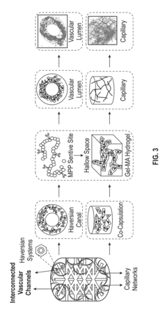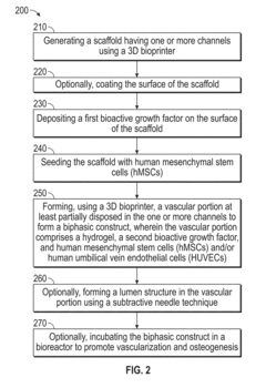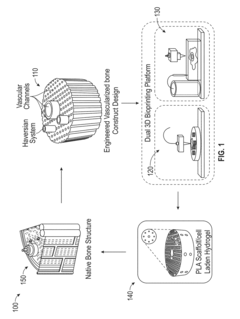Growth factors and signaling molecules are essential for promoting vascularization in bioprinted tissues. Factors such as vascular endothelial growth factor (VEGF), basic fibroblast growth factor (bFGF), platelet-derived growth factor (PDGF), and angiopoietins can be incorporated into bioinks or delivered through controlled release systems. These bioactive molecules stimulate endothelial cell proliferation, migration, and tube formation, leading to the development of functional vascular networks within the engineered tissues.Expand Specific Solutions05 Perfusion systems and bioreactors for vascularized tissue maturation