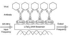 - A shear horizontal surface acoustic wave (SH-SAW) biosensor using a lithium tantalate (LiTaO3) wafer with surface-bound ligands that specifically bind to target agents, generating measurable acoustic waves for detection, allowing for real-time identification and quantification of bioagents without pre-processing of samples.